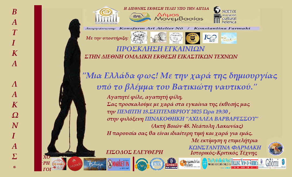 Η Ελλάδα καλωσορίζει την παγκόσμια καλλιτεχνική κοινότητα στη νέα ομαδική διεθνή έκθεση εικαστικών τεχνών με τίτλο «ΜΙΑ ΕΛΛΑΔΑ ΦΩΣ! Με την χαρά της δημιουργίας υπό το βλέμμα του Βατικιώτη Ναυτικού».